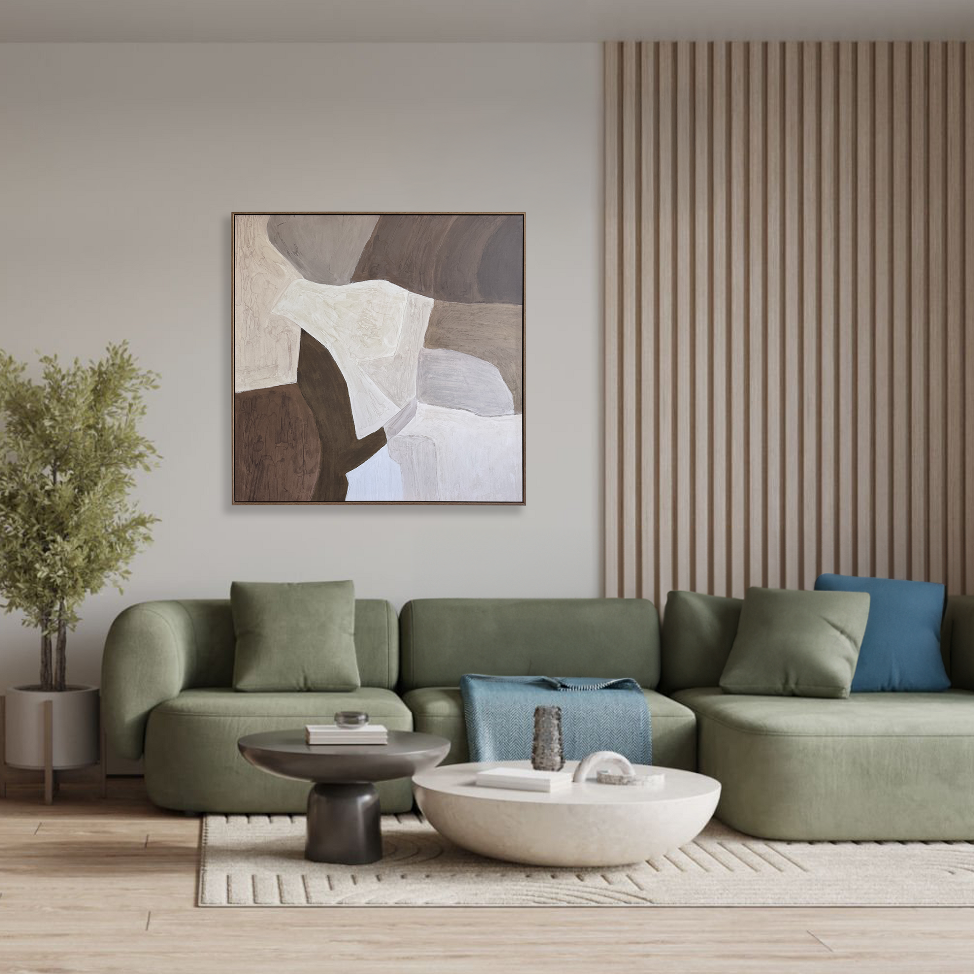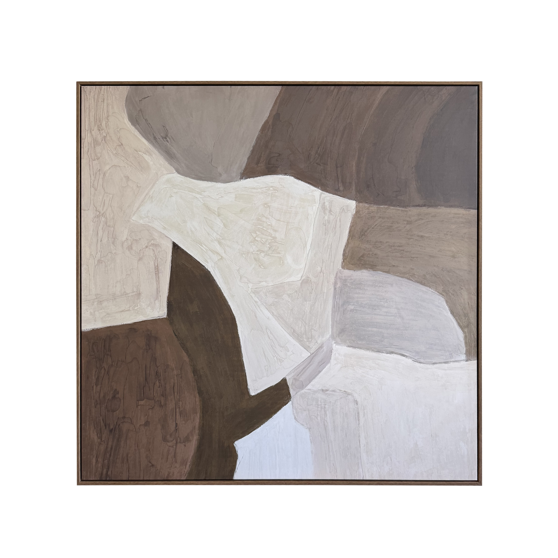Make a bold statement with this large 100 x 100 cm abstract artwork. Framed in a natural oak finish, it beautifully blends rich earthy tones with dynamic abstract shapes, creating depth and intrigue in any space. This striking piece brings warmth, texture, and contemporary style - perfect for elevating a living area, bedroom, or entryway with effortless sophistication.