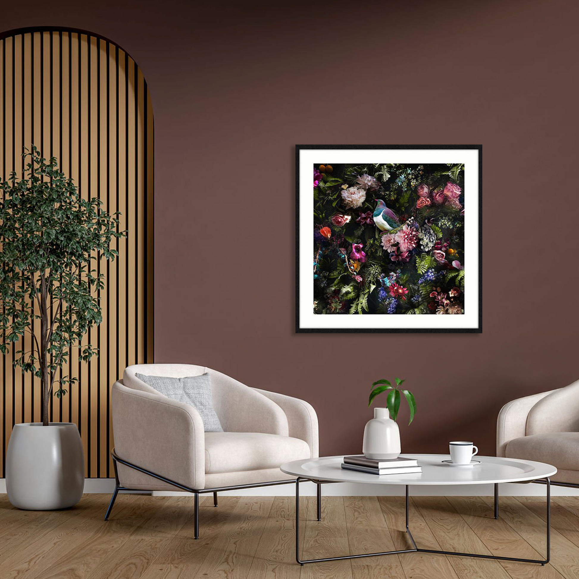 Elevate your space with a striking portrait of New Zealand’s iconic Kererū, beautifully captured in timeless detail. Set within a crisp white matt board and sleek black frame, this 100x100cm statement piece balances natural beauty with refined sophistication.